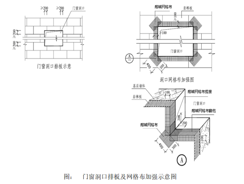 1)門窗洞口、女兒墻、結(jié)構(gòu)變形縫、系統(tǒng)變形縫、檐口、勒腳等處的保溫層終端部位均應(yīng)在粘貼A級不燃保溫板前,先行粘貼翻包用的窄幅160級耐堿玻纖網(wǎng)布,其壓入勻質(zhì)防火保溫板和翻包尺寸均不少于100mm;